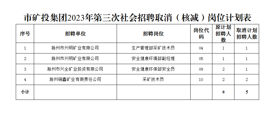 根據(jù)《滁州市興滁礦業(yè)投資集團(tuán)有限公司2023年第三次社會(huì)招聘公告》規(guī)定,經(jīng)對(duì)各崗位報(bào)名情況篩查審定,結(jié)合資格復(fù)審情況,部分崗位報(bào)名情況未達(dá)到開考比例,經(jīng)研究決定取消(核減)以下崗位招聘計(jì)劃: